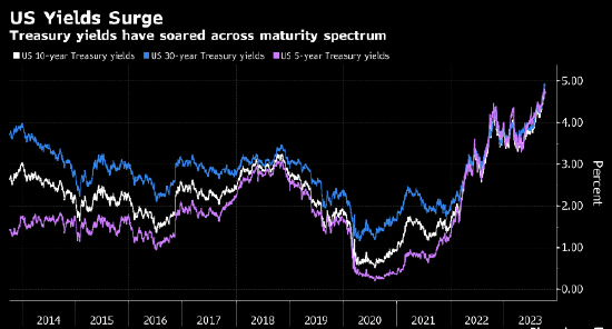 周五的就业数据公布后,10年期美债收益率一度攀升至4.89%,创下2007年全球金融危机爆发前以来的最高水平,较年初高出约1个百分点。