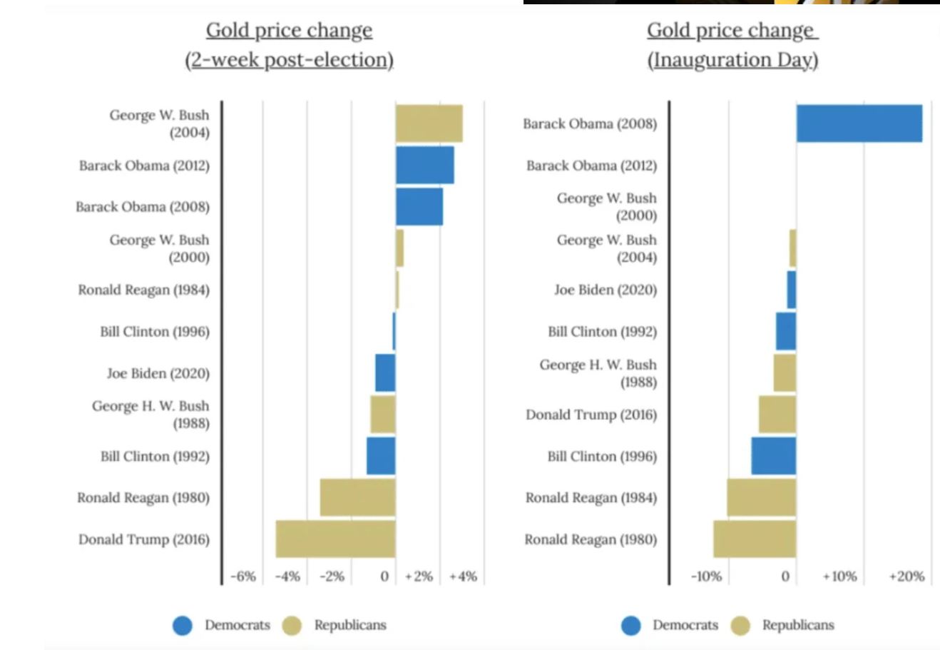 根据Deseret News最近的一篇文章,黄金价格根据美国总统大选的结果而波动——共和党获胜后黄金价格下跌,民主党获胜刺激黄金价格上涨。