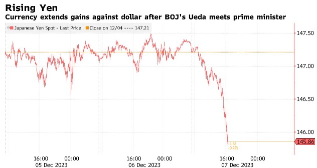 日元兑美元汇率的涨幅扩大至1.6%左右,突破了145关口,创下三个多月来的最高水平。其次,日元兑10国集团(G10)所有货币都走高。Stonex Financial Pte外汇交易员Mingze Wu表示:“外汇交易商似乎乐于冒着日本央行12月行动的风险买入日元。”
