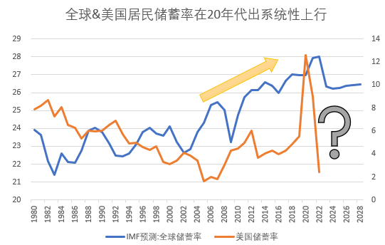 但目前,这样的储蓄-投资局面出现了不确定性。一方面疫情后美国储蓄率大幅回落,全球的储蓄水平也向下调整。而在投资方面,地缘政治凸显导致全球贸易链重构;以AI为代表的技术升级投资;以及能源和绿色能源转型投资或推动投资率的合理回升。