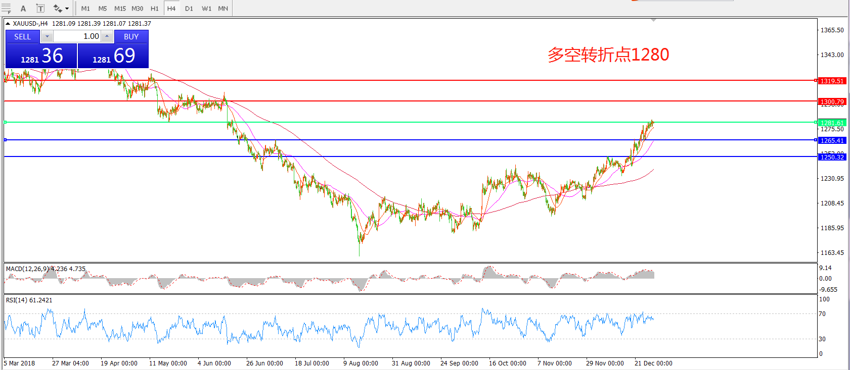 4小时图看,黄金强势突破1280阻力,短期走势偏强,均线呈多头排列,MACD红柱增加,仍以多头思路对待后市。