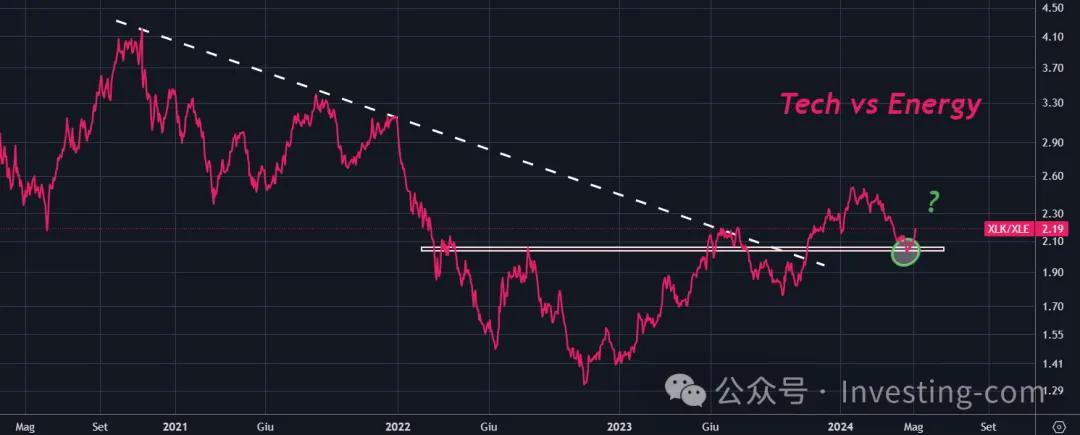 这种潜在的通胀情景可能会重新点燃科技股相对于能源股的强势行情。科技股在之前的阻力位上找到了支撑,表明供需关系发生了变化,买入压力已经超过了卖出压力。下跌趋势的停顿显示,科技板块可能出现逆转,并有望重回上升趋势。