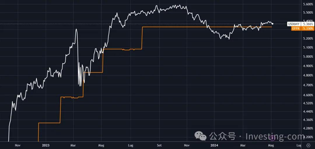 债券市场似乎预期6个月后会降息。通常情况下,如果市场预期在这段时间内降息,6个月期美国国债的收益率将至少比当前的联邦基金利率低0.25%。但当前情况并非如此,这表明12月的FOMC会议是可能降息的最早时间点。