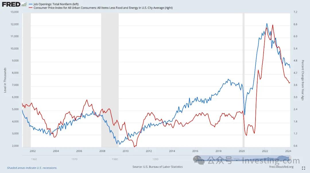 在此背景下,我们可以观察到非农就业岗位的持续下降,降至2021年2月以来的最低水平,达到848.8万,而非农就业岗位与通胀动态相关,特别是与核心个人消费支出(PCE)通胀有明显的相关性。