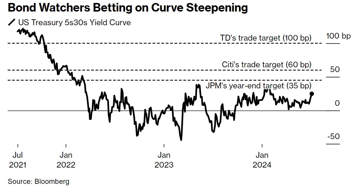 另一方面,道明证券的策略师预计,5 年期和 30 年期债券收益率之间的利差最终将从现在开始翻两番,达到 100 个基点。美联储降息是这一预测不可或缺的一部分,该行自去年以来一直坚持这一预测。但道明证券的Gennadiy Goldberg和他的团队上个月底写道,无论 11 月哪个政党获胜,高赤字的威胁也同样存在。